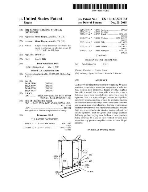 Abstract: A dry goods filtering storage container comprising dry goods container comprising a removable top portion, a body portion, a one or more chambers, a height, a width, a depth, a first side, a second side, a front side, a back side, a top, a bottom, a one or more hinged closures and a one or more lid apertures. Said one or more hinged closures are capable of selectively covering said one or more lid apertures. Said one or more chambers comprising a one or more upper chambers and a one or more lower chambers. Said one or more upper chambers are separated by a one or more horizontal dividers. Said one or more horizontal dividers having a plurality of divider apertures. Said dry goods filter storage container holds dry goods of varying sizes. Said one or more chambers being separated by a one or more vertical dividers. Said removable top portion comprises a one or more hinged closures.