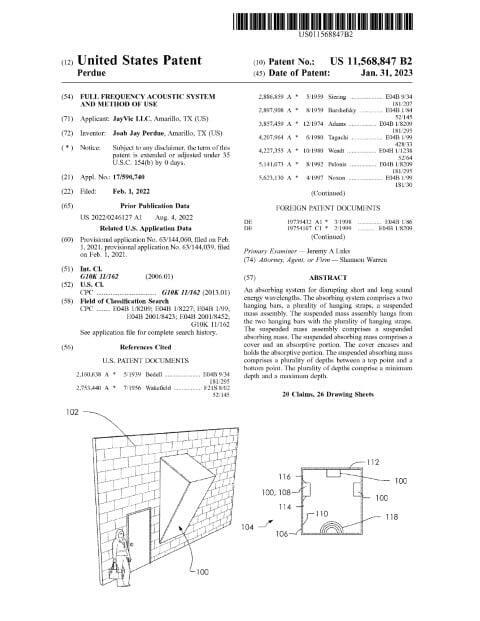 This patented system, filed February 1, 2022 and granted January 31, 2023, protects a novel approach to broadband acoustic absorption that combines suspended mass, tapered absorber geometry, and tuned membrane elements. Inventors based in Amarillo, TX and applicant JayVic LLC (Amarillo, TX) developed a framed assembly in which a suspended absorbing mass hangs within an air gap from two hanging bars via straps, allowing free twisting motion and enhanced vibration dissipation. The absorptive core uses a tapered (substantially triangular) cross section with a continuum of depths from minimum to a maximum depth around 25–35 inches, enabling progressive disruption of wavelengths from subwoofer bass to high frequencies. Complementary acoustic plates form parallel membrane chambers and can be tuned in material and thickness to target subwoofer and low-frequency bands while replaceable exterior panels and clip interfaces provide practical installation in performance spaces and architectural settings. The firm’s prosecution secured claims that cover the mechanical suspension, depth-gradient absorber, membrane arrangements, and the configuration that permits dynamic motion—demonstrating both technical depth and strategic claim drafting to protect system-level and component-level innovations.