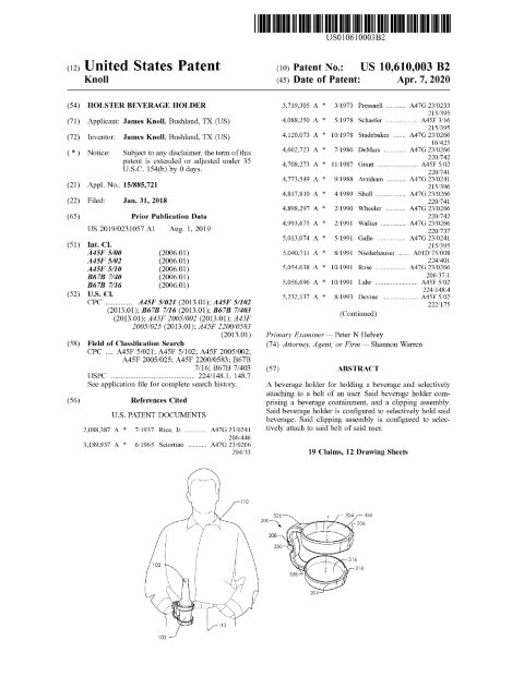 This patent describes a belt‑mounted beverage holder with a modular clipping assembly and an integrated handle that combines containment, tool functionality, and flexible mounting. Filed on January 31, 2018 and granted on April 7, 2020, the application—prosecuted for inventors and the applicant based in Bushland, TX—protects a beverage containment having aligned upper and lower rims to restrain lateral movement, plus a handle incorporating both a bottle opener and a pry tab. The novel clipping assembly separates into a button clip adapter and a belt clip: a C‑shaped clamp secures to the upper rim while a button‑and‑holster interface provides a gravity‑assisted, rotatable attachment that accommodates left‑ or right‑handed configurations.