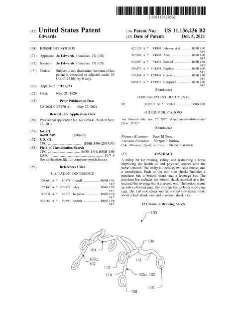 Filed on November 23, 2020 and granted on October 5, 2021, this patented utility bit reflects careful engineering to improve equine mouth comfort and rider control. Inventors based in Canadian, TX developed a mouthpiece and dual-shank assembly in which each side shank integrates a purchase bar, bottom shank, and leverage bar that rotate about dedicated axes. The mouthpiece features a raised port, offset, lower port bars, support bars, and purchase channel bars that accept the purchase bars so the shanks rotate without undesired fore-aft movement. By routing lower port bars fully into the purchase channel bars and raising the port above the channel, the design relieves tongue pressure, concentrates contact on fleshy tissue rather than dental bars, and reduces rubbing and shifting during use. The specification and claims delineate precise channel lengths and ring geometries to ensure repeatable leverage and controlled force transfer for training and restraint applications. Our firm’s drafting captured the mechanical relationships and functional objectives clearly, supporting a robust grant and demonstrating technical depth in equine equipment innovation.