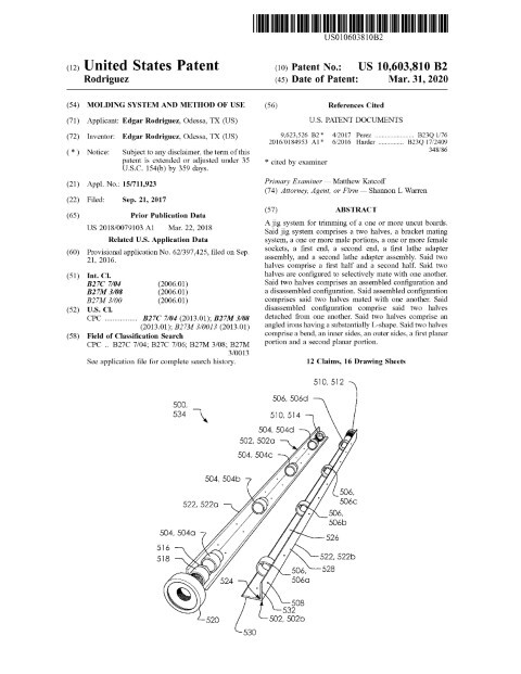 This patented jig system delivers a practical and robust approach to producing turned moldings directly from standard lumber. Filed on September 21, 2017 and granted on March 31, 2020, the disclosure—by inventors based in Odessa, TX—describes a two‑half, bracket‑mating jig that mounts to a lathe via dedicated headstock and tailstock adapters. The assembly combines L‑shaped angled irons, male/female mating features, a bracket mating bolt and threaded sleeve, and a jaw‑chuck ring so the jig can be secured quickly to common lathe chucks. Designed to hold multiple flat boards around a central rotating axis, the system permits rapid one‑pass turning of rope, fluted, beaded and custom profiles while eliminating the adhesive block‑building step used in prior art. The specification highlights adjustability along the center axis and straightforward assembly/disassembly, enabling repeatable, low‑waste production runs.