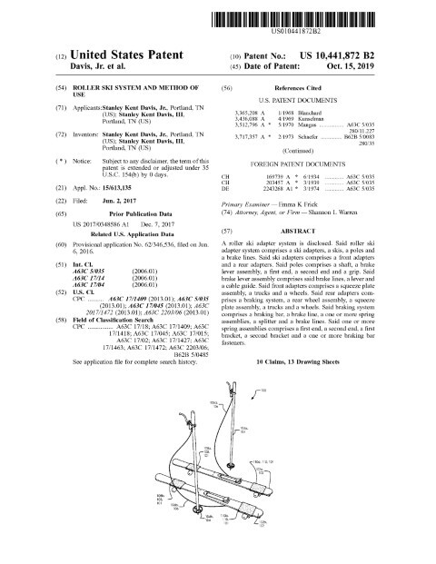 This roller-ski adapter system, filed in June 2017 and granted in October 2019, converts conventional snow skis into road-capable training platforms while preserving ski integrity and controllability. Developed by inventors based in Portland, TN, the disclosure describes front and rear adapter assemblies that clamp to a wide range of ski constructions using cork-padded squeeze plates, skateboard-style trucks and wheel assemblies. Poles incorporate brake lever assemblies and cable guides that actuate brake lines routed through a lower brake compartment; pulling the lever translates line tension to a braking bar that is guided by rail slots and opposed by spring assemblies. The specification carefully balances secure attachment with ski flex, detailing bent and unstressed configurations and dimensional examples (e.g., wheel and brake-bar sizing) to avoid binding or debris interference. The firm’s drafting captures both practical retrofit advantages and mechanical nuance—tensioned braking, guided motion, and protective padding—ensuring broad claim coverage and clear enablement for manufacturing and commercialization.
