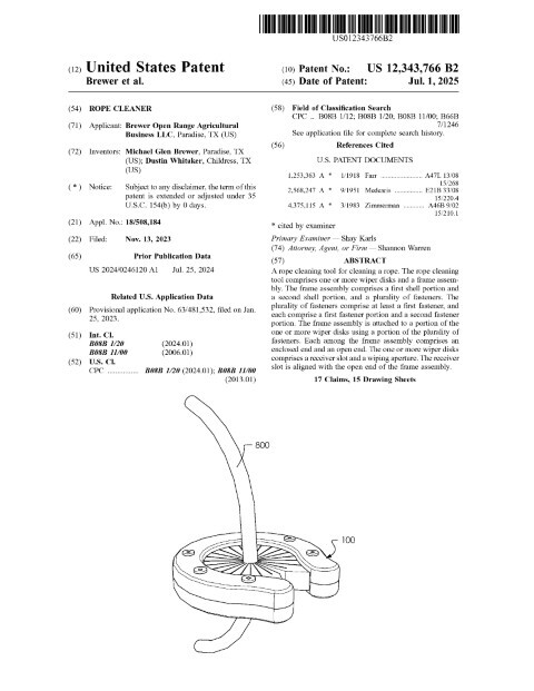 This patented rope cleaning system, filed in November 2023 and granted on July 01, 2025, captures a practical, mechanically robust solution for reliably removing debris from ropes without disassembly. Developed by inventors based in Paradise, TX and Childress, TX and prosecuted with strong claim scope, the design combines a two‑part frame with replaceable wiper disks that accept a rope through a receiver slot aligned with an open frame end. Radial slots and bristle segments around a central aperture allow the disks to deform under an inward squeeze, tightening around rope fibers to abrade and extract contaminants while preserving core integrity. The frame’s fastener architecture, inner diameter lip and optional posts maintain alignment and permit multi‑layer stacks of wiper disks in varied materials (nylon, plastic, 3D‑printed PLA) and thicknesses for configurable stiffness and wear life. The receiver slot enables inserting a rope into the wiping aperture without taking the tool apart, and the fastener arrangement makes the wipers serviceable, reducing long‑term maintenance cost.