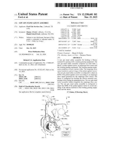 Filed October 30, 2023 and granted March 25, 2025, this patent describes a saw gin stand safety assembly that combines mechanical design improvements with sensor-driven control to increase capacity and reduce operational risk in cotton ginning. Inventors based in Lubbock, TX and an applicant based in Lubbock, TX developed an arrangement that isolates the picker-agitator motor on a variable-frequency drive and equips it with an amperage draw sensor. A dedicated controller interprets the amperage signal and dynamically adjusts picker-agitator RPM to prevent choking or clogs in the throat and rotating ginning equipment, while leaving the saw blade and brush assemblies to run at optimal speed. Hardware choices—direct drive relationships, in-cabinet motor mounting that removes idler belts, and an enlarged throat—combine with programmable control logic to deliver measurable improvements in throughput and safety. Additional design details, such as a lower front inspection window that functions as a fire-monitoring door, demonstrate attention to real-world operational hazards.