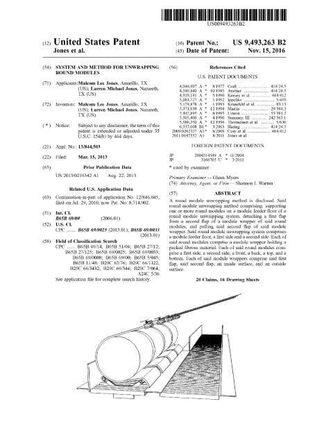 This patent describes a robust mechanical system and method for reliably unwrapping cylindrical, fibrous-product modules (exemplified by cotton) at high throughput. Filed on March 15, 2013 and granted on November 15, 2016, the claims cover an integrated arrangement of titling feeders, a longer primary feeder, and under-floor module rotators that lift, orient, and uniformly rotate round modules so flap attachments can be broken and wrappers removed without contaminating the product. Inventors based in Amarillo, TX and Nazareth, TX developed a coordinated pulling assembly that uses either clamps or a hook-and-loop clasp to engage an exposed flap, combined with controlled pulling forces and feeder tilting to roll the unpacked fibrous material onto the primary conveyor. The specification also protects key mechanical details such as accumulator-assisted pulley arms, belt-driven rotators, wind boards, and various clasping and line attachment options.