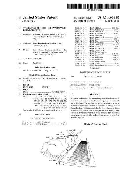 This patent describes a robust, production-ready system and method for unwrapping round modules (exemplified by cotton modules) designed to deliver uniform, contaminant-free feed for subsequent processing. Filed July 29, 2010 and granted May 6, 2014, the claims define a coordinated arrangement of a tilting module feeder, primary feeder, cutter, tensioning lines and hook assemblies, and pivoting paddles that together automate wrapper removal while protecting packed fibrous material. The specification emphasizes multiple feeder alignments, interchangeable conveyor floor types, and tensioning mechanisms (pulley/counterweight or tension clutches) to reliably strip tarpaulin covers without allowing wrapper fragments to contaminate the product. Inventors based in Amarillo, TX and Nazareth, TX assigned the rights to the inventor Practical Innovations, LLC (Hereford, TX). The drafting highlights practical deployment details—catwalks, wind boards and reset operations—reflecting careful attention to operability and gin-floor constraints. The claims are structured to cover single and dual tilting feeders, hook-and-line tension systems, and predictable module transfer to the primary feeder, demonstrating breadth and enforceability in the mechanical/material‑handling arts.