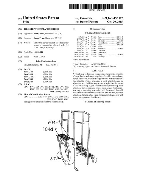 Filed March 7, 2014 and granted October 20, 2015, this patent describes a mechanically robust step system designed to provide safe, repeatable access to service areas of heavy vehicles by mechanically interfacing with a vehicle tire. Inventors based in Shamrock, TX pursued a practical solution combining a wheeled frame, multiple fixed steps with OSHA-consistent spacing, handrails, and a hinged adjustable step that rotates to rest on the top portion of a tire. The adjustable element employs telescoping inner and outer tubing with indexed adjustment holes and fasteners for both horizontal and vertical positioning, and a bracket that secures against the tire sidewall for lateral stability. A wheel assembly on the frame facilitates transport and compact storage when the adjustable step is retracted.