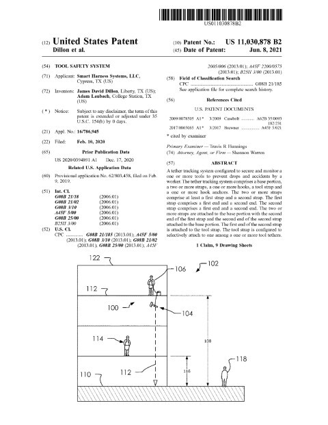 This patent describes a tether tracking system designed to secure and monitor tools to prevent drops and accidents at elevated worksites. Filed on February 10, 2020 and granted on June 8, 2021, the disclosure reflects careful drafting to protect a hybrid mechanical-electrical safety solution. Developed by inventors based in Liberty, TX and College Station, TX for an applicant based in Cypress, TX, the system combines reinforced straps, modular hooks and anchors, and embedded conductive lines to create an auditable, real‑time check that tools remain properly tethered. A compact controller monitors grounding signals carried through the straps and hook anchors; if none of the monitored lines are grounded, the controller issues an alarm locally or over a network to supervisors, and logged events can be stored on a server for compliance and incident analysis. The specification supports multiple embodiments including harness integration, tool bags housing the controller, and optional device applications for remote alerts.