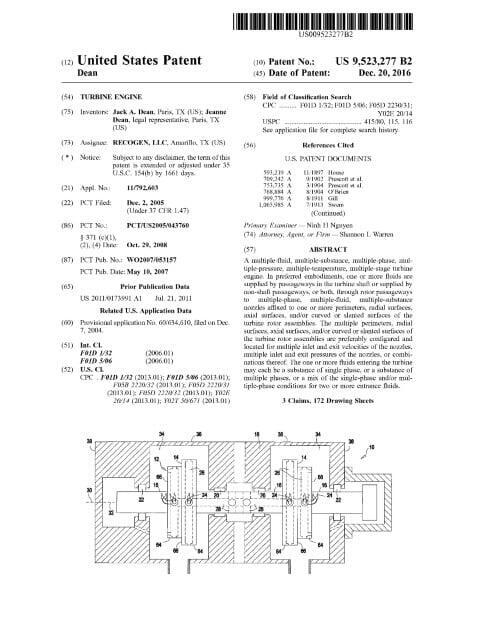 This patent describes a highly flexible turbine architecture that routes multiple fluids and fluid conditions through shaft and non-shaft passageways into nozzle-equipped rotor surfaces, enabling multi-phase, multi-substance, multi-pressure and multi-stage operation. Filed in December 2005 and granted in December 2016, the specification supports bladeless (no-blade) nozzle-driven rotors that accept liquids, vapors, mixtures or reactants at different pressures and temperatures, and recover energy from feed, bypass and waste streams without requiring conventional inlet separation. Inventors based in Paris, TX developed the core concept; the applicant is based in Paris, TX and the assignee is RECOGEN, LLC (Amarillo, TX). The claims and detailed embodiments show extensive control of chamber pressures, staged compounding (axial and radial), and integrated heat-exchange/condensing options to tailor the split between mechanical output and useful thermal energy. The drafting anticipates use cases from geothermal and waste-heat streams to combined-cycle and combustion turbine installations, and incorporates balancing, sealing and modular rotor-section strategies to simplify manufacture and maintenance. The firm’s prosecution and drafting demonstrate technical depth and careful claim scaffolding to cover both shaft and non-shaft feed architectures and multi-fluid combustion/nozzle combinations.